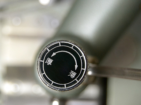 「漉き厚調整ダイヤルゲージ」は、皮漉き機の使用時に、ダイヤルをひと目盛り 0.1mm単位で調整できるゲージです。